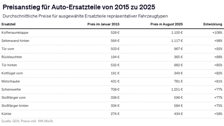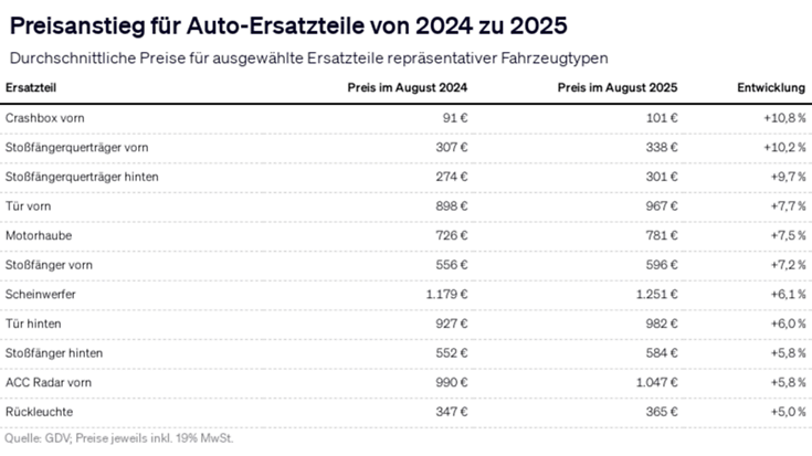 Die Tabelle zeigt, dass Kfz-Ersatzteile wie Scheinwerfer, Stoßfänger und Windschutzscheiben Zwischen August 2024 und August 2025 erneut teurer geworden sind. Im Schnitt stiegen die Preise um knapp sechs Prozent , bei einzelnen Teilen wie Kühlergrills sogar um rund acht Prozent.