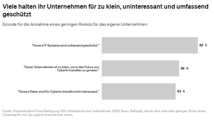 Die Grafik zeigt, dass die meisten Entscheider und IT-Verantwortlichen in kleinen und mittleren Unternehmen die Gefahr eines Cyberangriffs abstrakt als hoch einschätzen, aber diese Bewertung nicht auf ihr eigenes Unternehmen übertragen.